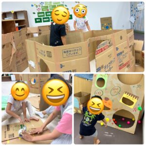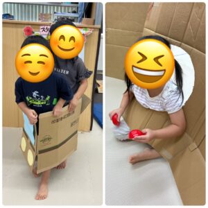 ことのはの教室では、大きなダンボールを使って、車に見立てて遊んだり、 お家を作ってそこからごっこ遊びへと遊びを発展させたりと、 それぞれ好きな遊び方で楽しむ事が出来ていました☺️