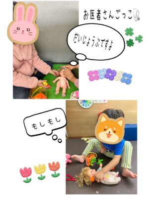 また、お人形を座らせてご飯を食べさせてみたり、職員が「ドーナツくださぁーい🍩」と言うと「ちょっとまってくださぁーい」とお店屋さんごっこに発展したりなど楽しんでいます😁